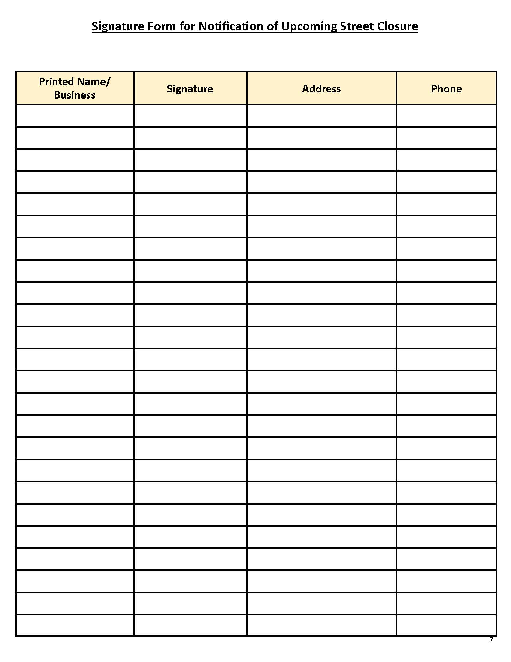 Print out the signature form and have completed by the business/es affected by the Street Closure